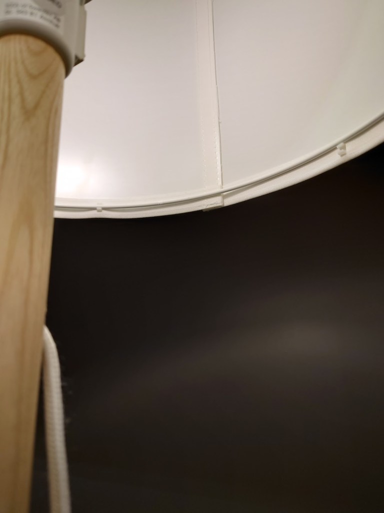 However, I found the new shapes and colours on display inspired me. It was mostly monochrome (black and white on display there). I grew curious about how they managed only to charge £8.00 for a floor lamp. I then began to look more closely at how these were made and noticed how they used plastic clips to attach the ring to the fabric.