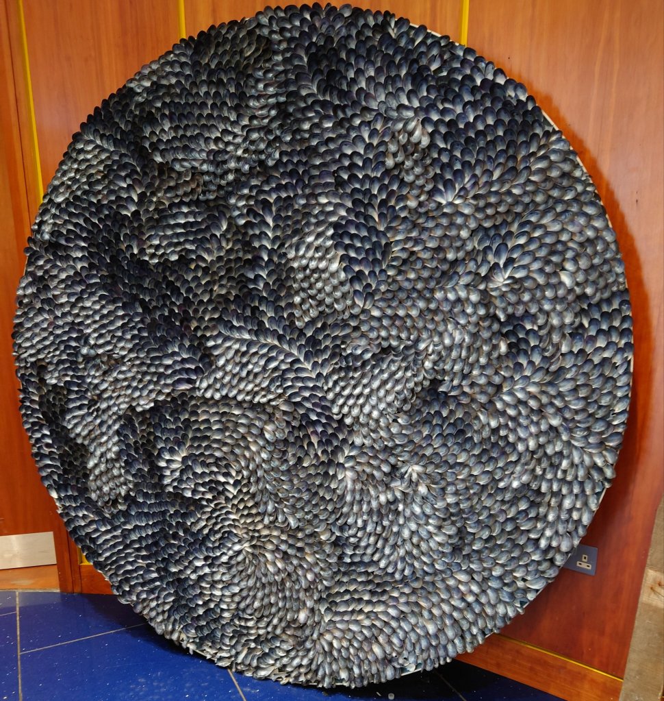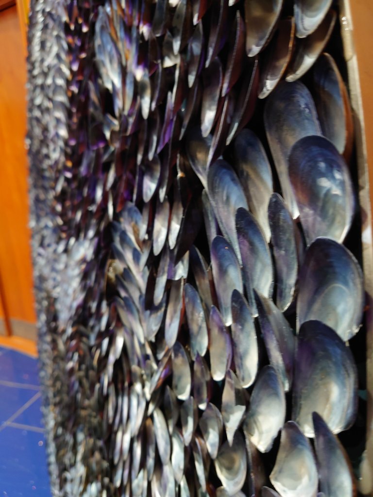 One piece of art I discovered was this circular, highly textured piece made of mussel shells. The artist is unknown. It was propped up in the offices of a seaweed-based cosmetic firm I visited. The cosmetic brand is design savvy. I loved and appreciated their bold choices with this piece of art. But because their product is made of seaweed, it was right that mussel shells were used.