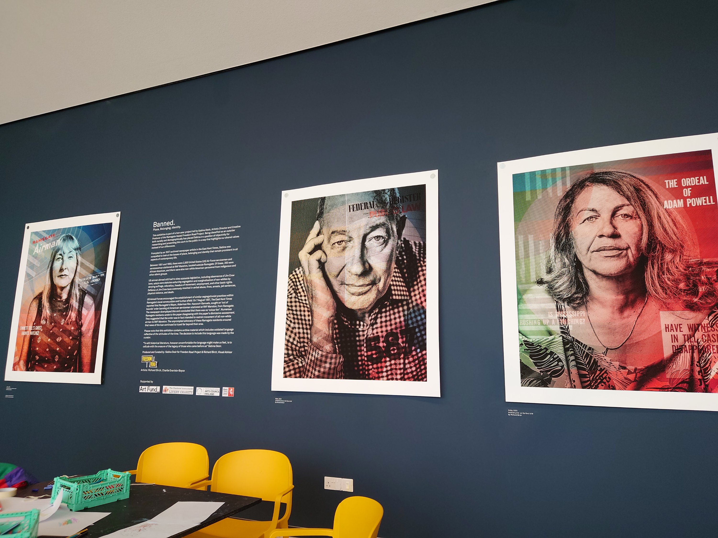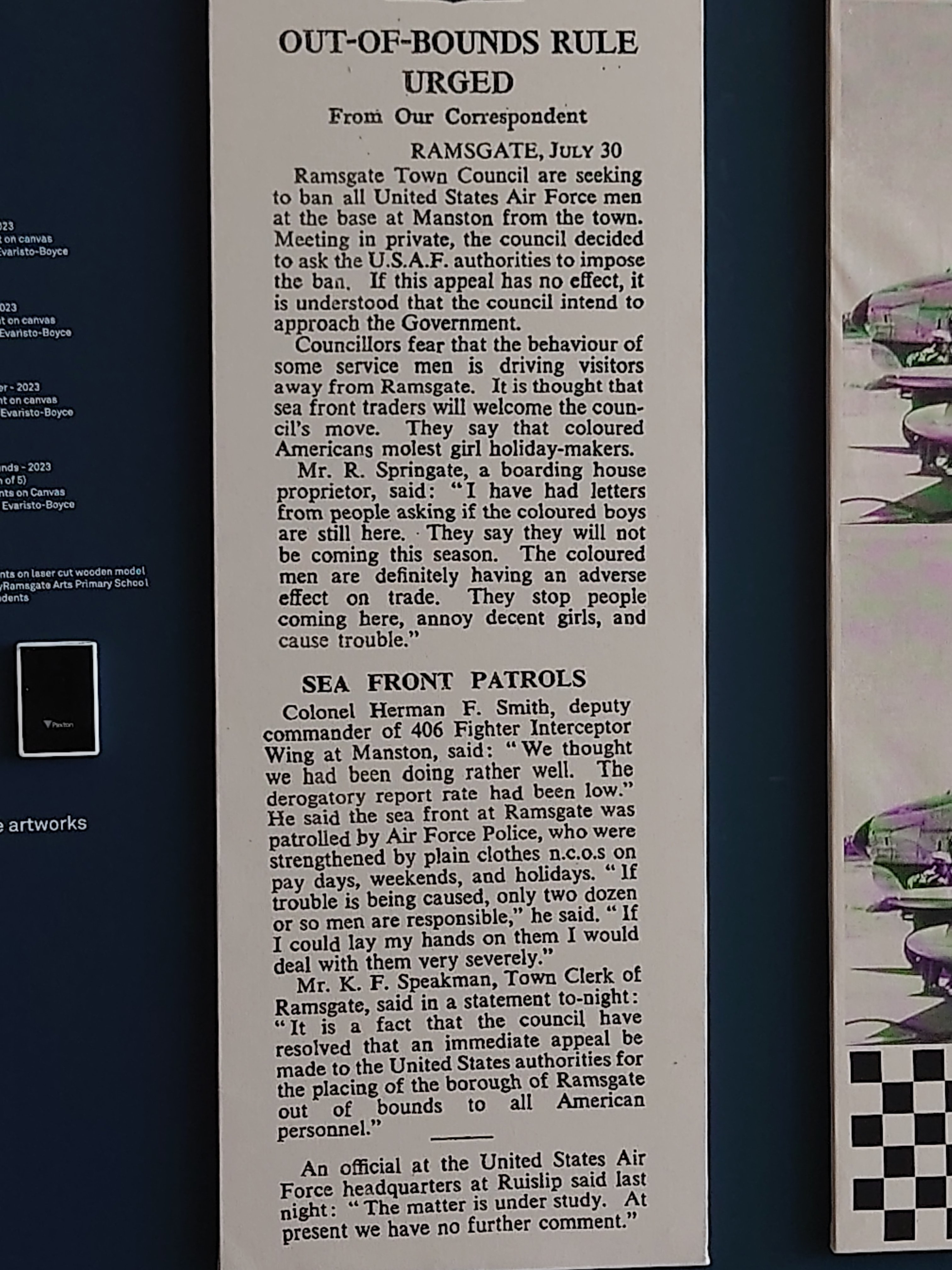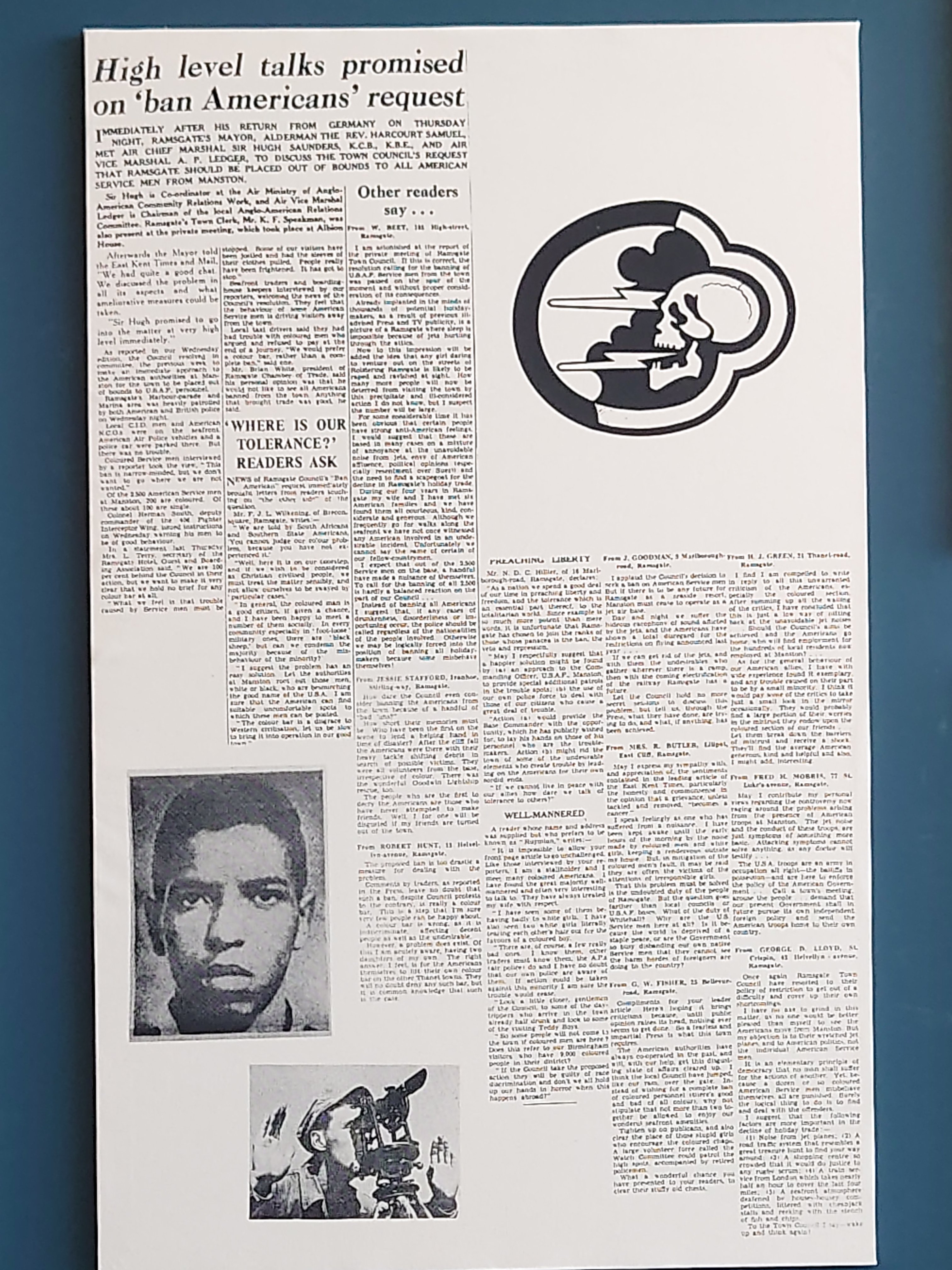 Banned by Sabina Desa. A sad study of the reporting around the wartime in the town and vicinity of Ramsgate when American soldiers came to help the UK in the second world war. There were calls for the black soldiers to be banned from socialising with the people of Ramsgate. Triggering phrases could be seen in the local newspaper reporting, which was blown up 1,000 times (perhaps) to make those words easy to read.