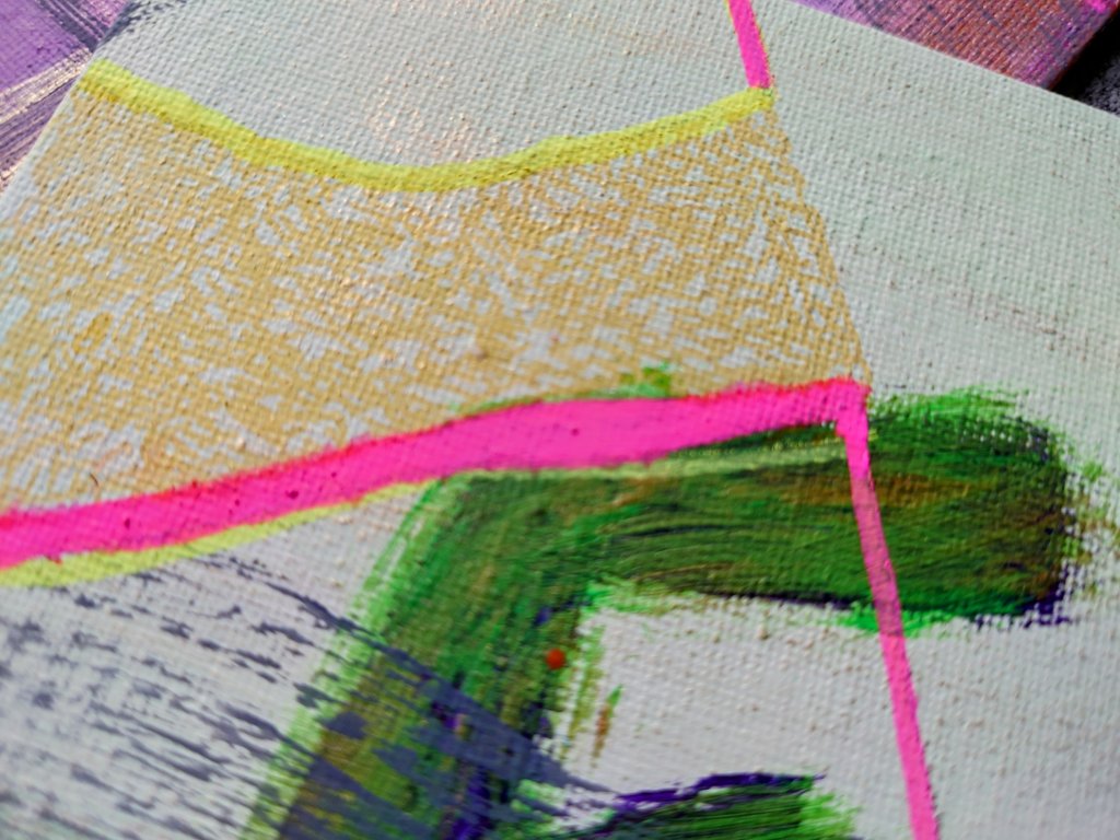 In the paintings this week I’ve gone to bold acidic florescent hued lines and contrasted with fervent calligraphic strokes of exceedingly dull neutrals on very ordinary mass produced shades.