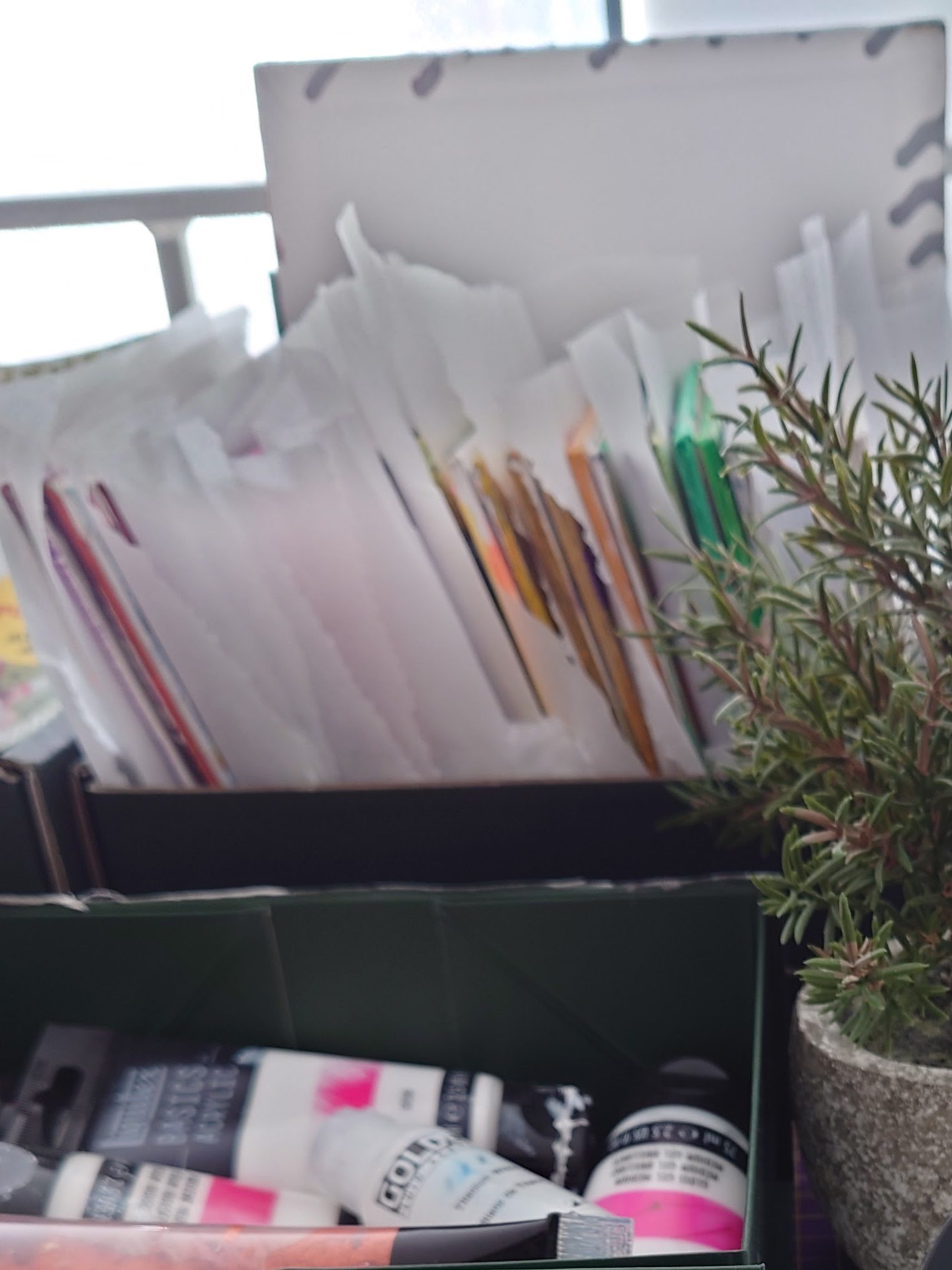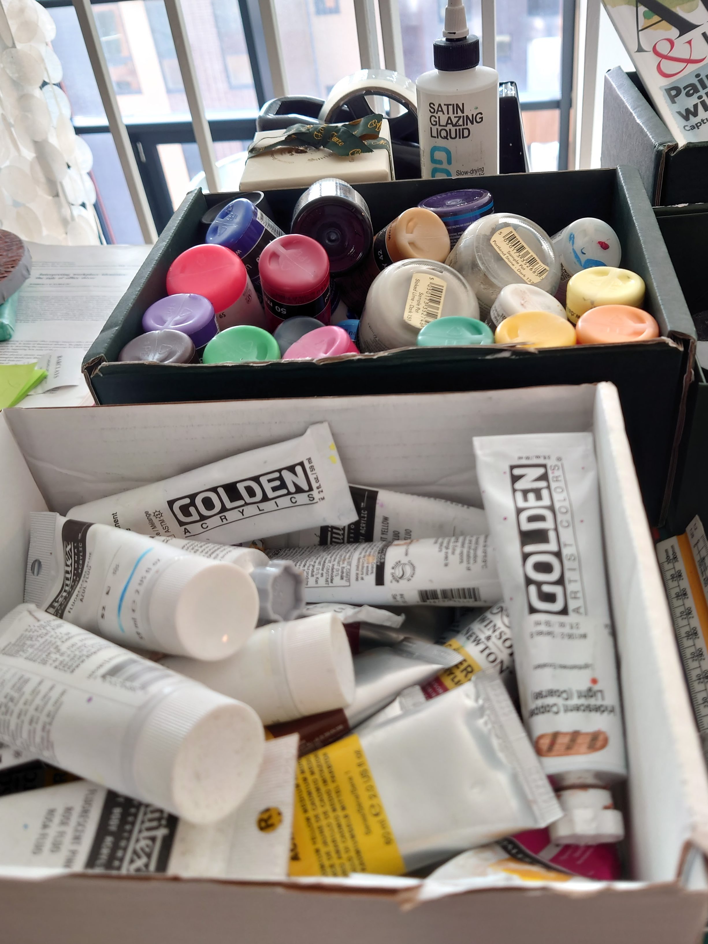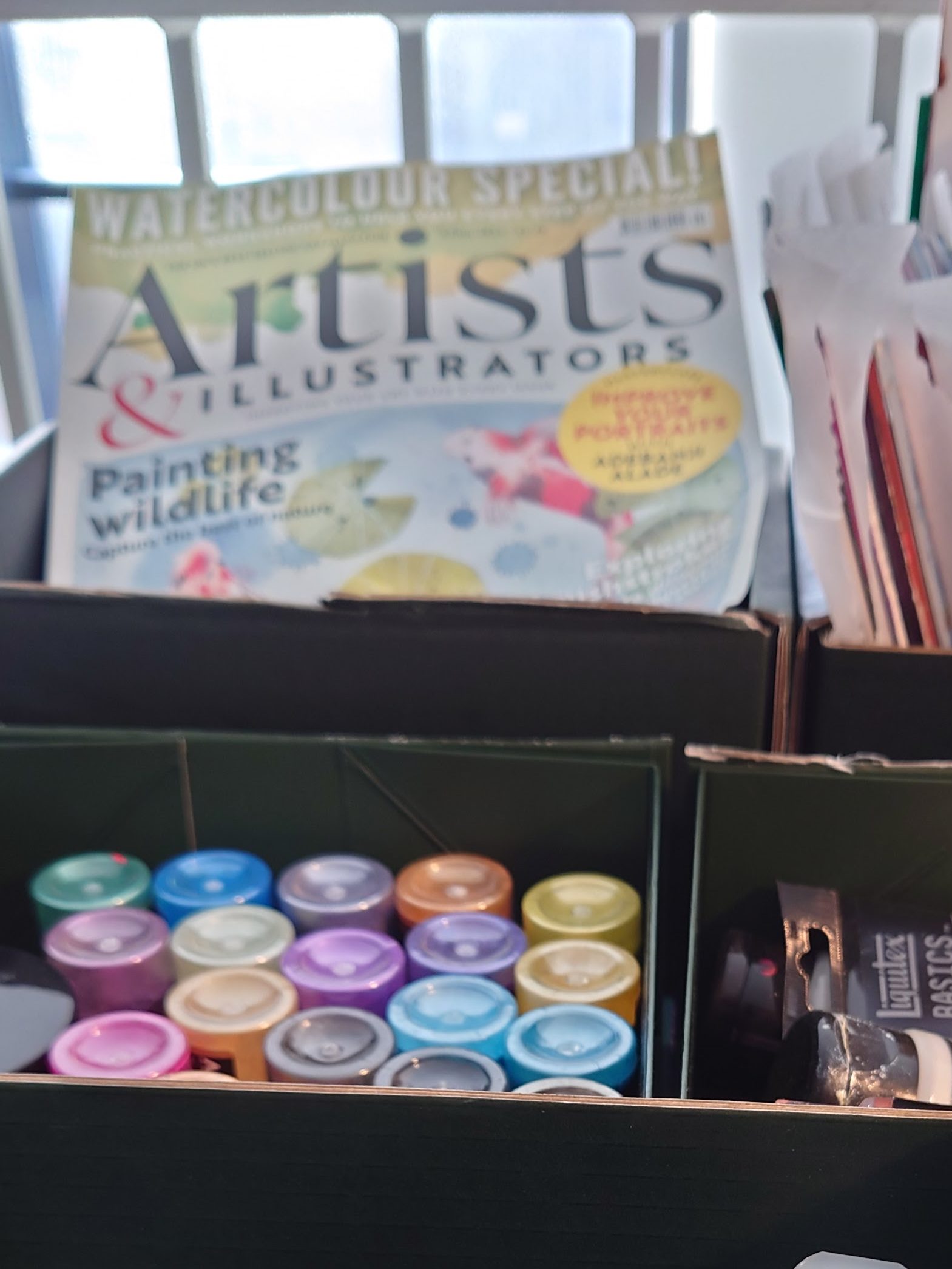 Below are more photos of artefacts portraying the growth in my art practice. You will see how I have graduated from storing things in a used Charlie Bingham tray to now using seven Haeckles Innovation boxes to store my paints and all kinds of other artistic bits and bobs.