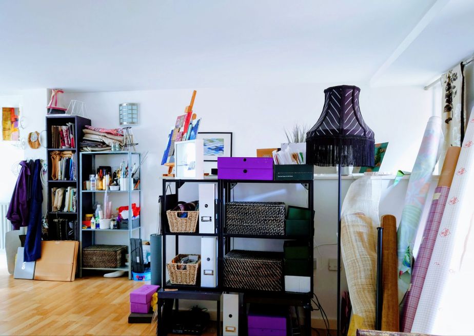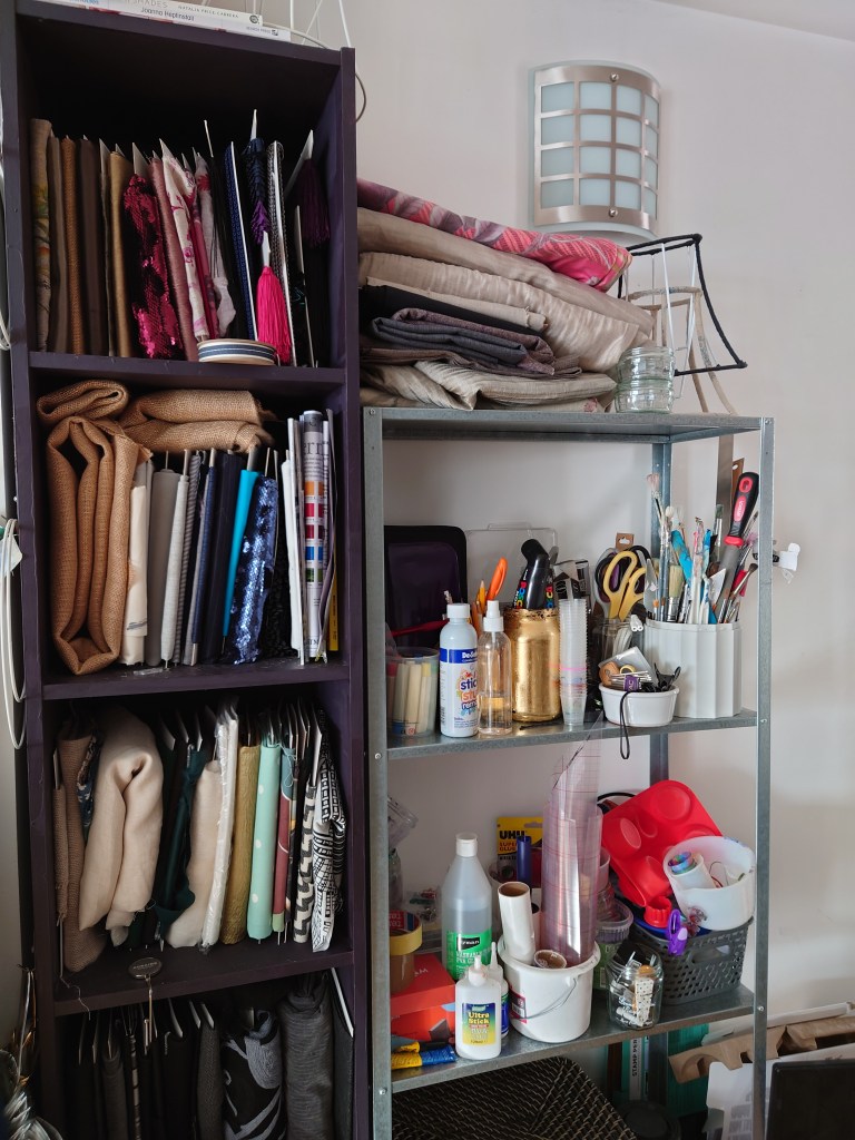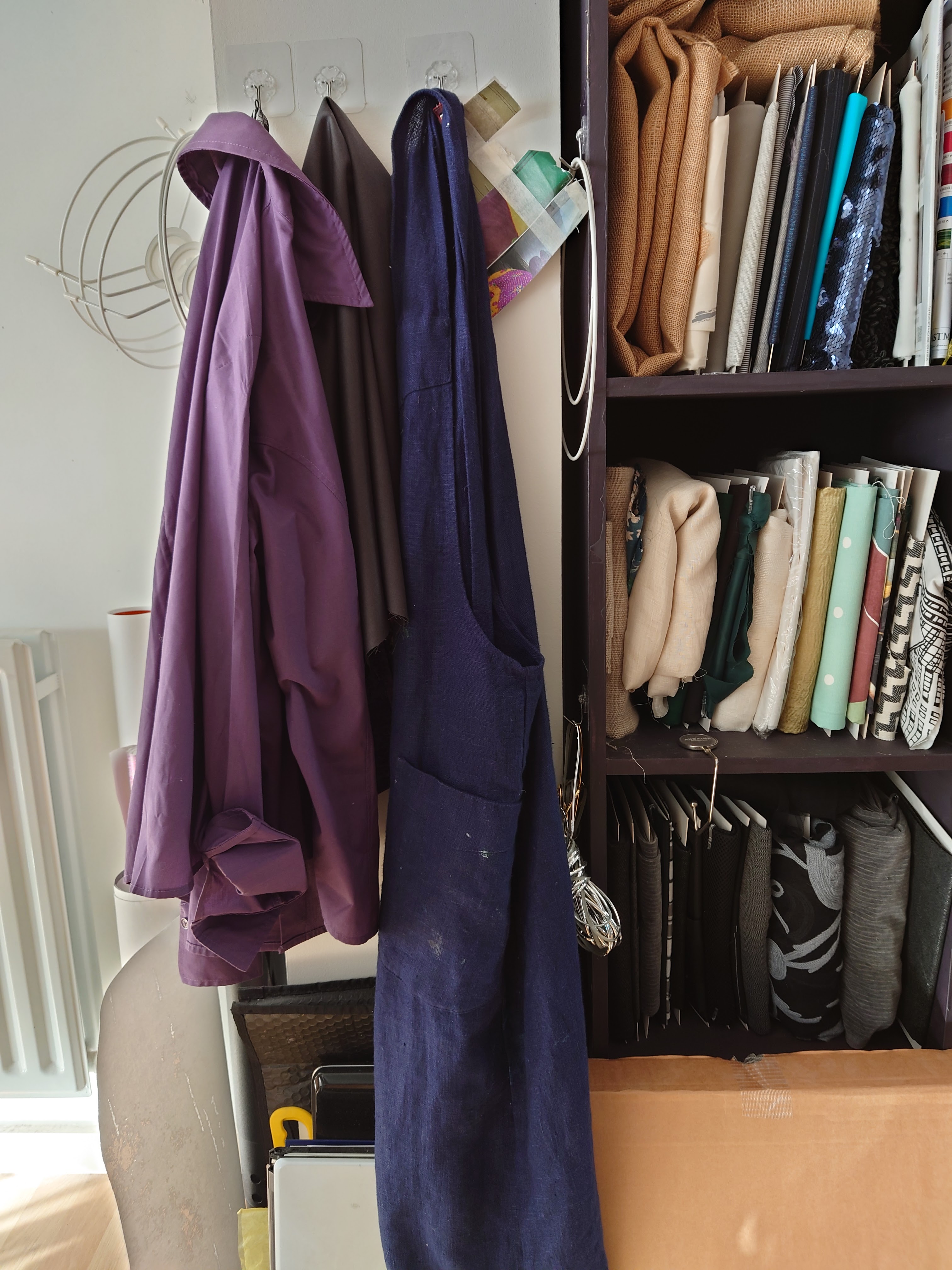 I have a place to hang my artist workwear and designated aprons. It’s next to a shelf just for fabrics.