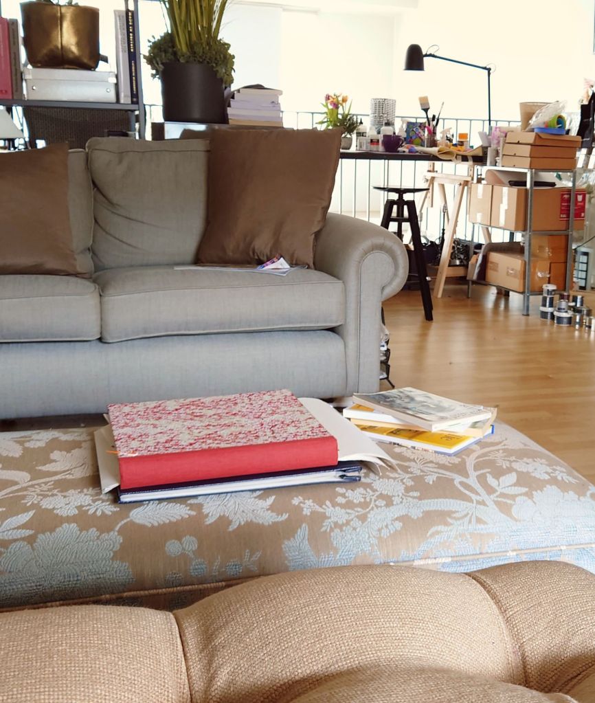 I trust you enjoyed a sneak peak of my studio. Hoping one day I can host customers, curators and commissioners here and help them choose things like fabric or colours and textures while convivially catching up on the latest news, celebrity gossip, and business title tattle, sipping a green tea and nibbling M&S’s petit macaroons. The mezzanine space was designed for live work and I’d like to use it to its fullest potential. It separates off the other part of my apartment dividing the living area and working area nicely. Upstairs mezzanine is the working area. And downstairs is for living.