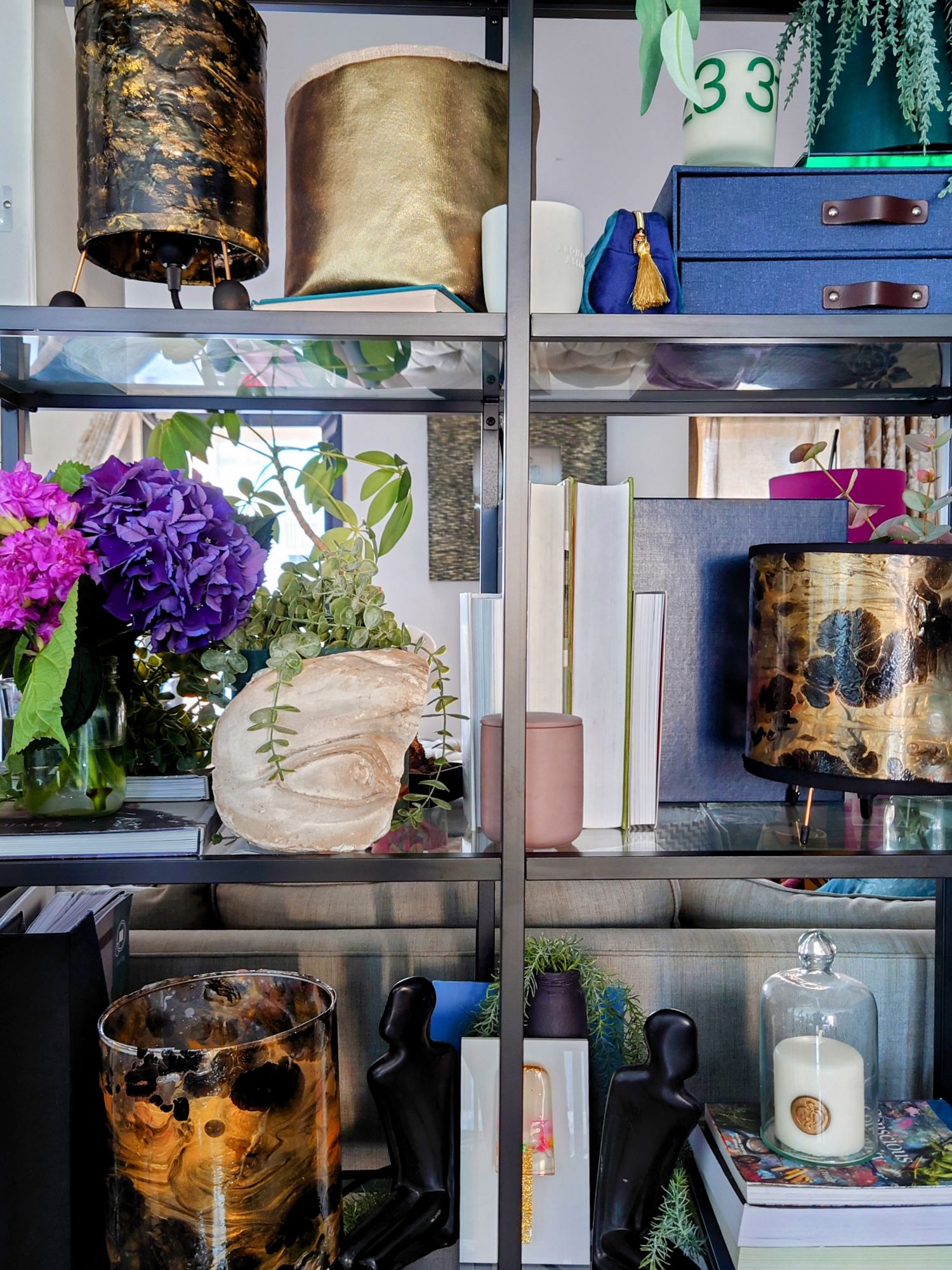 You can theme your shelf or backdrop beyond the colours of the books. The pictures below show how I have fallen into the trend of colour-coded bookshelves and am working to curate more meaningful staging for myself.