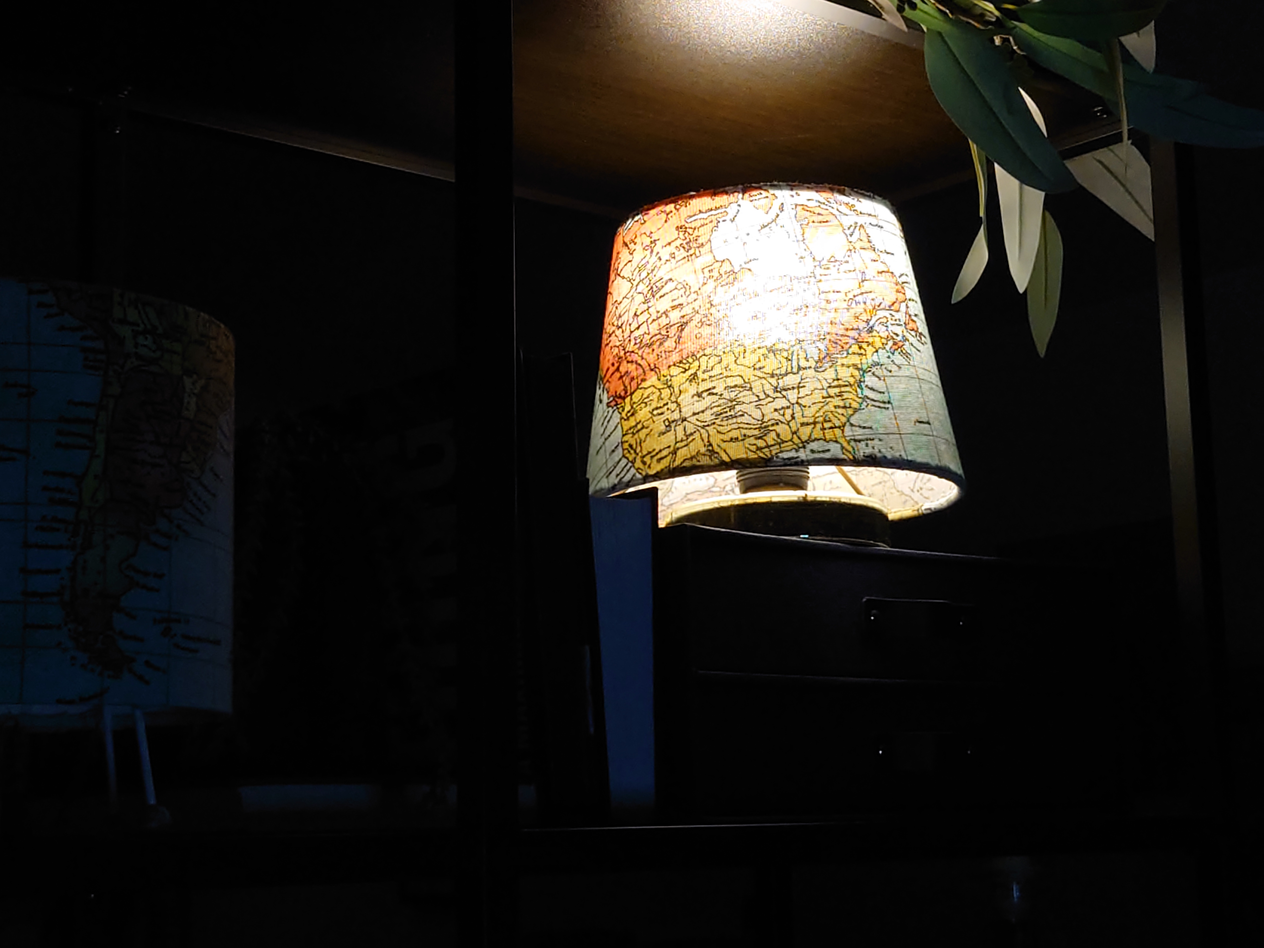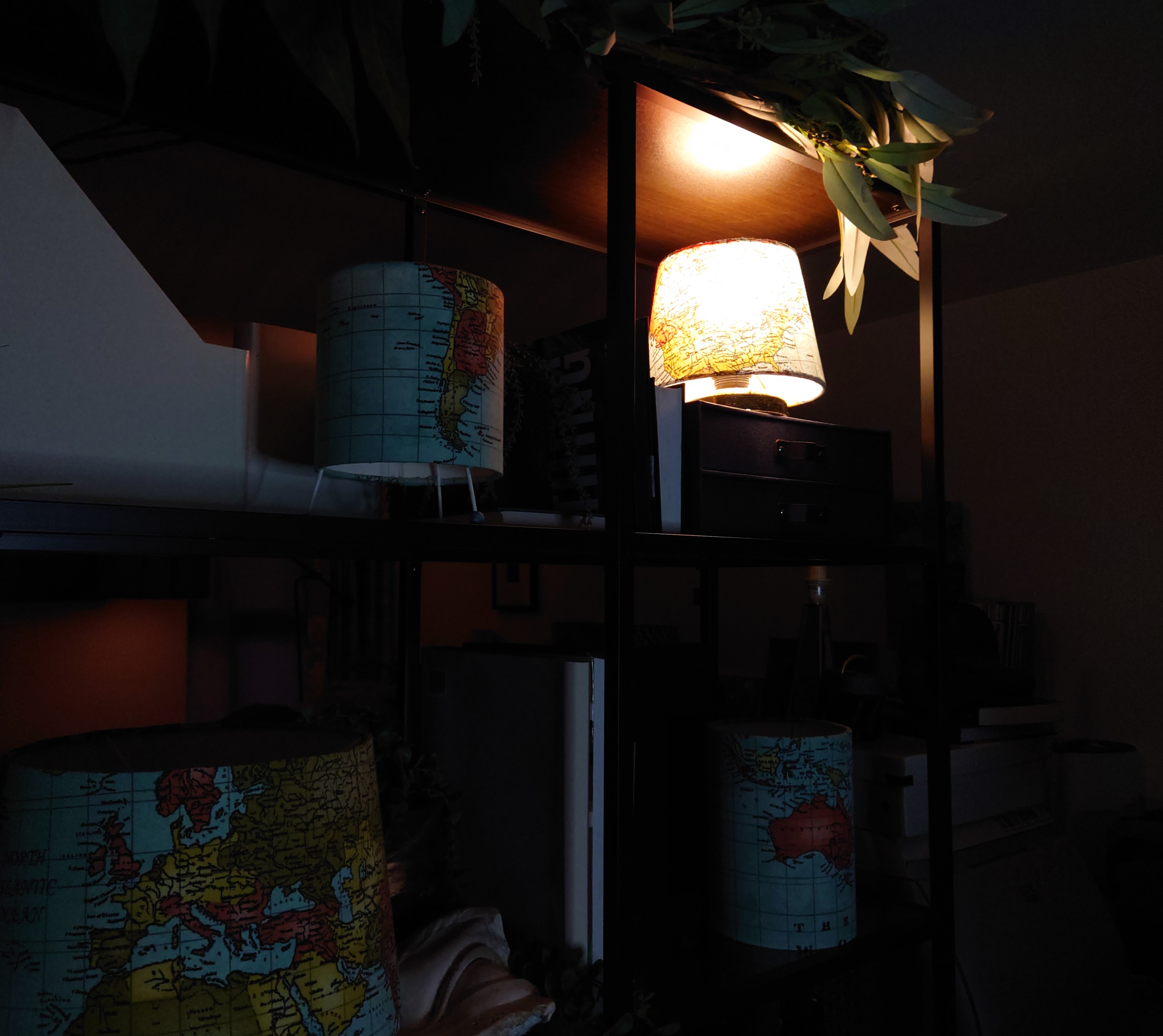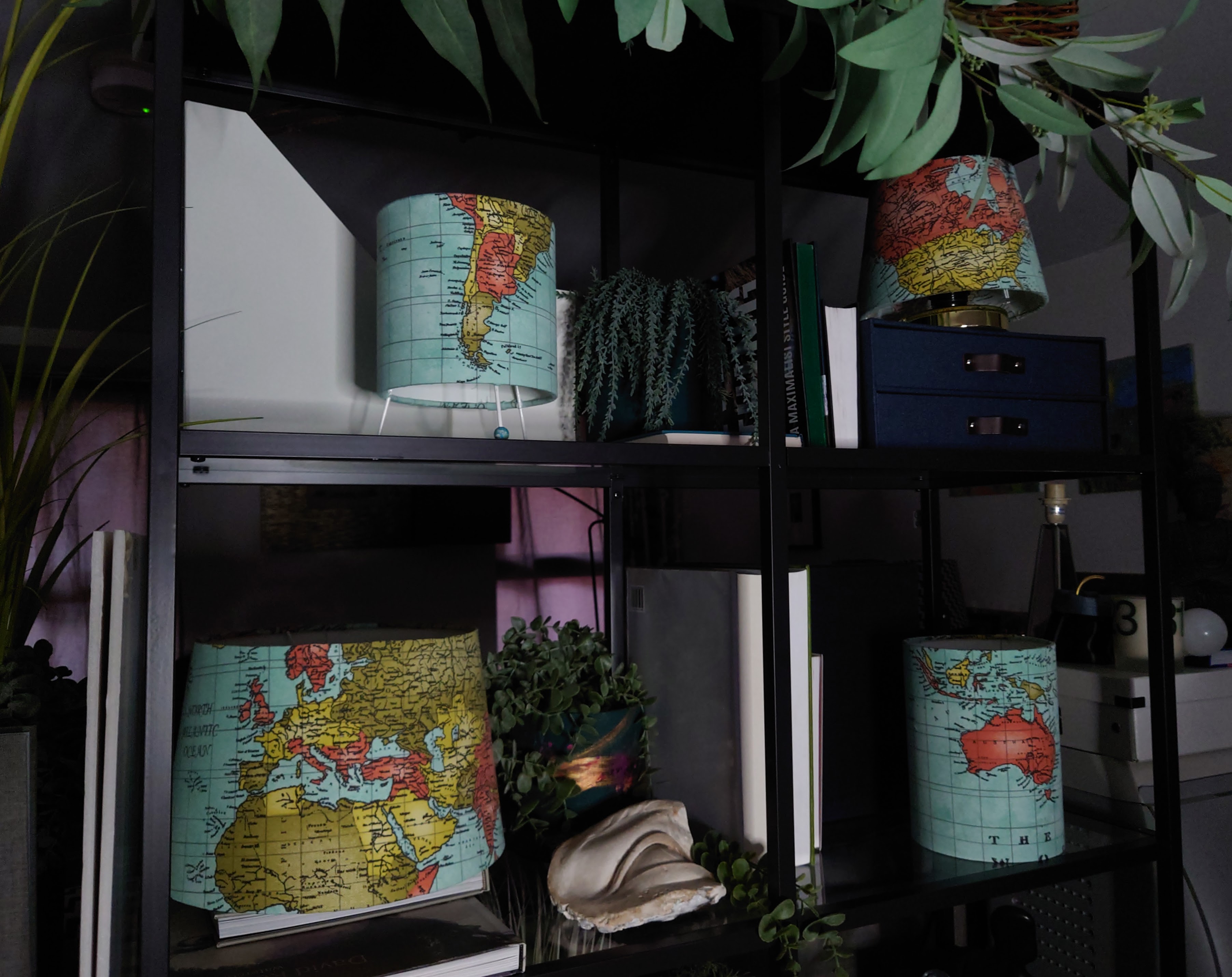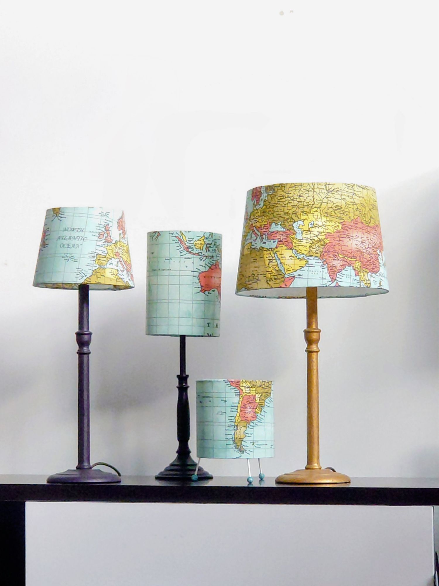 I made a series of world map lampshades and lighting designed for the shallow height of bookshelves.